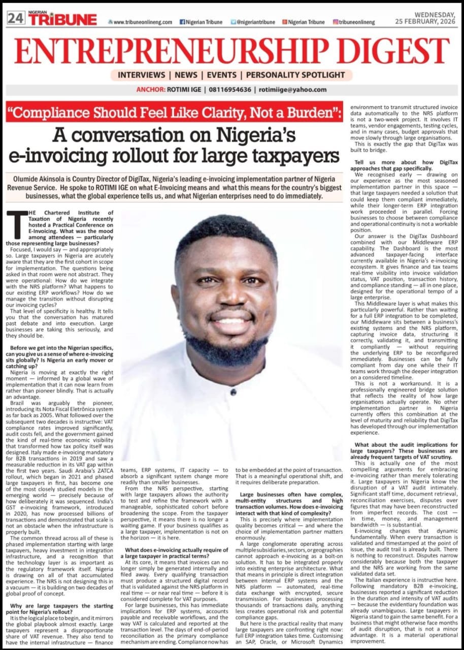 Following the recent CITN Practical Conference on E-Invoicing, Our Country Director at DigiTax Olumide spoke about what Nigeria’s e-invoicing rollout really means for large businesses and how to prepare without disrupting operations.